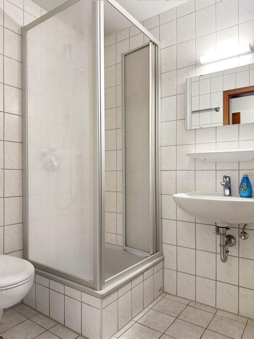 Das Badezimmer verfügt über Dusche, Waschbecken und WC.