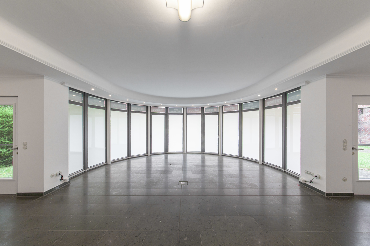 Im Inneren erwartet Sie ein großer offener Büroraum, dessen abblendbare Fenster entlang der Rundung die Möglichkeit bieten, mit einem Knopfdruck, einen Milchglaseffekt zu aktivieren. Ergänzt wird dieser durch einen zweiten, kleineren Büroraum, der sich ideal als Besprechungsraum oder privates Büro eignet. Ein weiterer Raum mit Küchennische bietet zum Beispiel Raum für Drucker und sonstige Lagerung, während das erst jüngst renovierte WC für moderne Annehmlichkeiten sorgt.