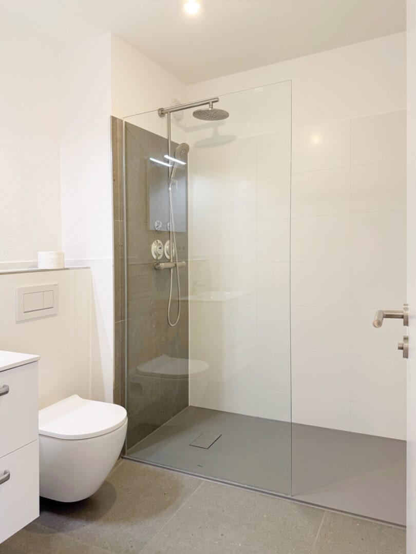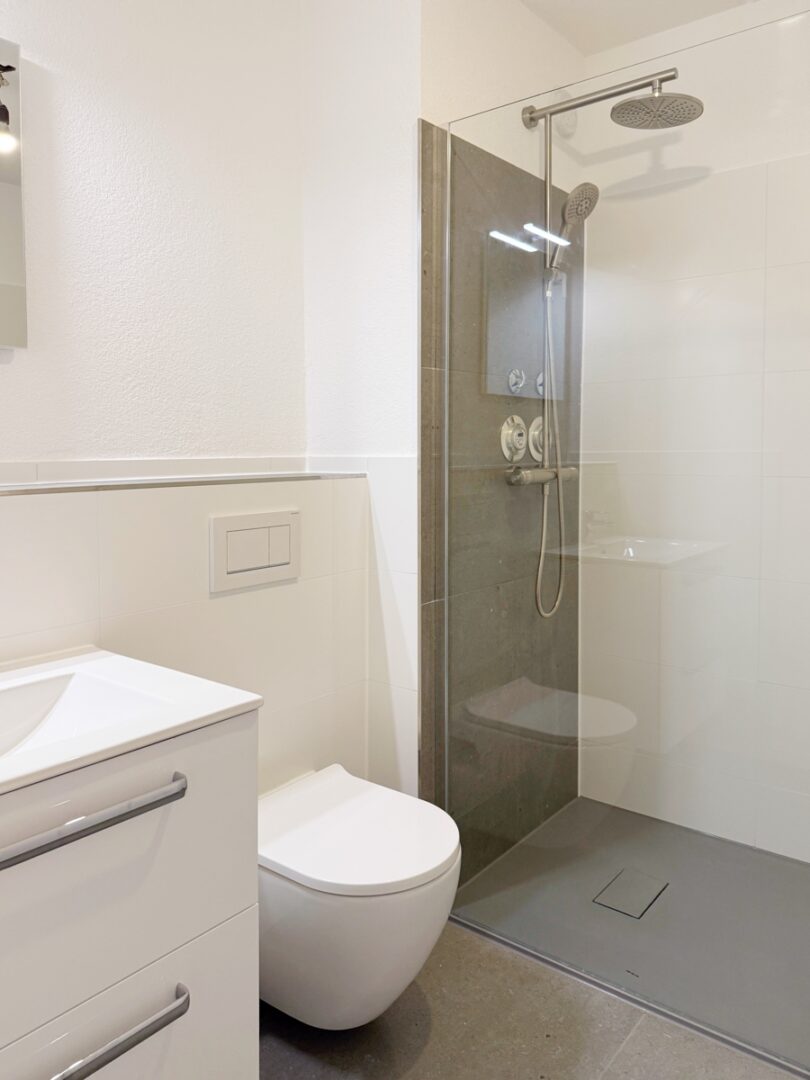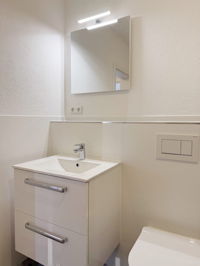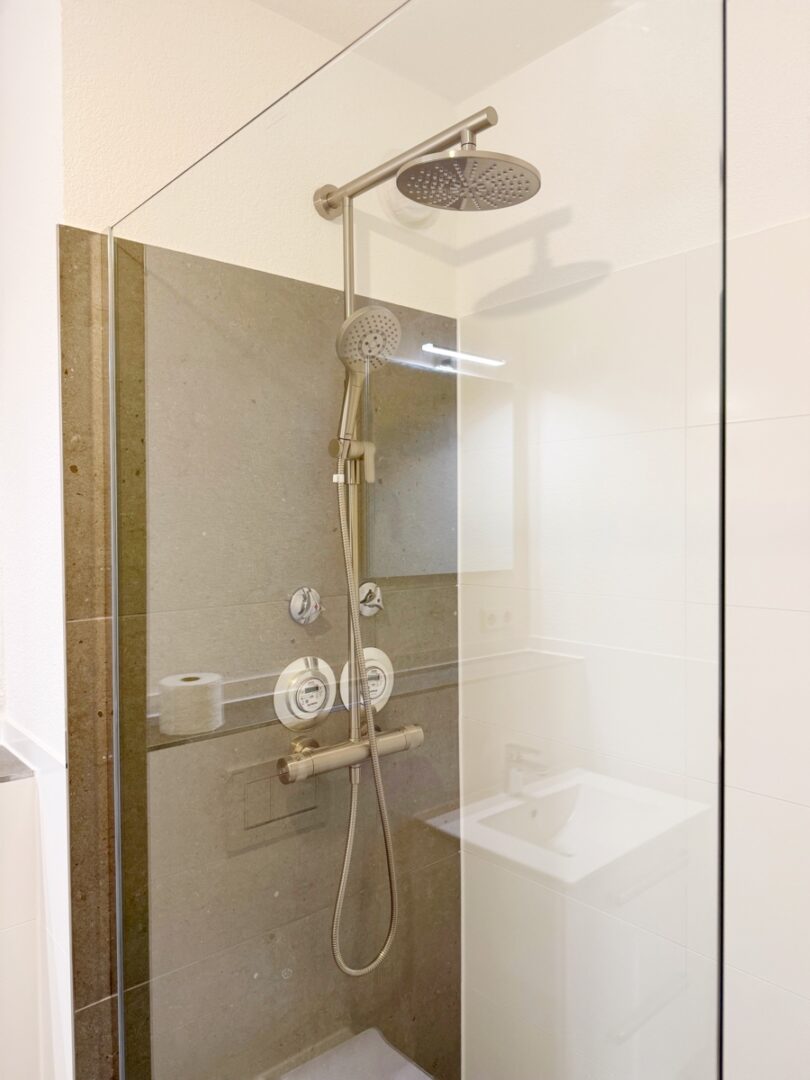 Das Badezimmer wurde ebenfalls vollständig erneuert und durchdacht gestaltet. Es erwartet Sie eine komfortable Dusche, ein eleganter Waschtisch, ein WC sowie eine praktische Handtuchheizung. Hier beginnt und endet Ihr Tag in einem Ambiente zum Wohlfühlen. Das helle und geräumige Schlafzimmer bietet ausreichend Platz für einen großen Kleiderschrank und ein gemütliches Bett – eine Oase der Ruhe, in der Sie entspannte Nächte und erholsamen Schlaf genießen können.